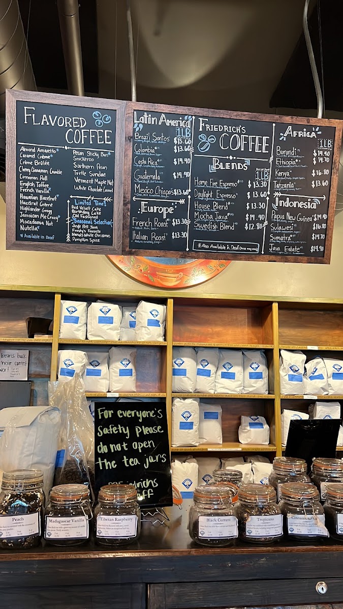 “ Beautiful cafe! It feels so comfortable in here! Plenty of seats indoor and there’s a fireplace!! There’s also seating outdoor for customers to enjoy beautiful sunny day while drinking coffee. The staffs are super friendly and cheerful ! They offer variety of coffee beans flavors and loose tea flavors! I personally love their caramel frappe!! Do download their app to collect rewards for free drinks ;) There’s plenty is parking space right in front of the cafe too ! Plus, they offer drive thru where you can just place an order and pick them up real quick. Definitely would recommend Friedrichs Coffee !! ”